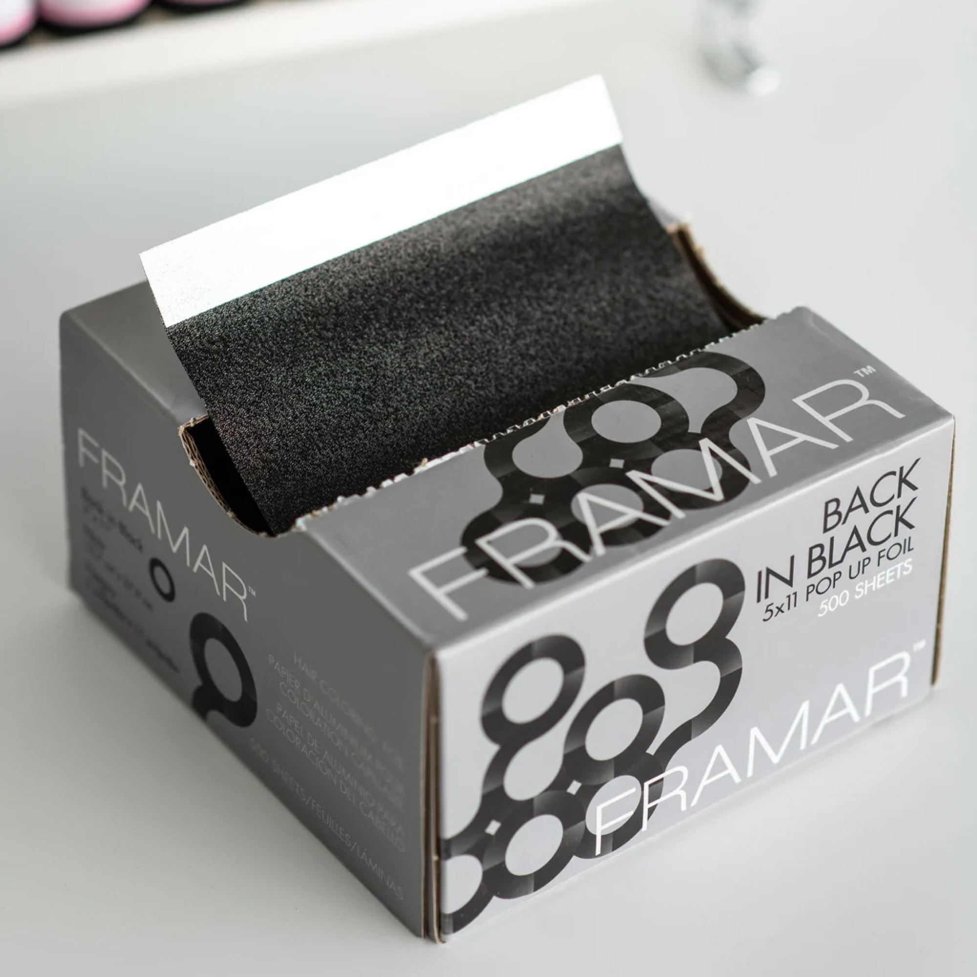 Eleganckie, czarne paski aluminiowej folii Framar (Back in Black), wymiar 5×11″ (~12,5×28 cm), 500 arkuszy gotowych do użycia — pre-cut i pre-folded, z tłoczoną (embossed) powierzchnią, zapewniającą doskonały chwyt, bez poślizgu i rozerwania, łatwe wysuwanie z pudełka typu “Push Up Base”.